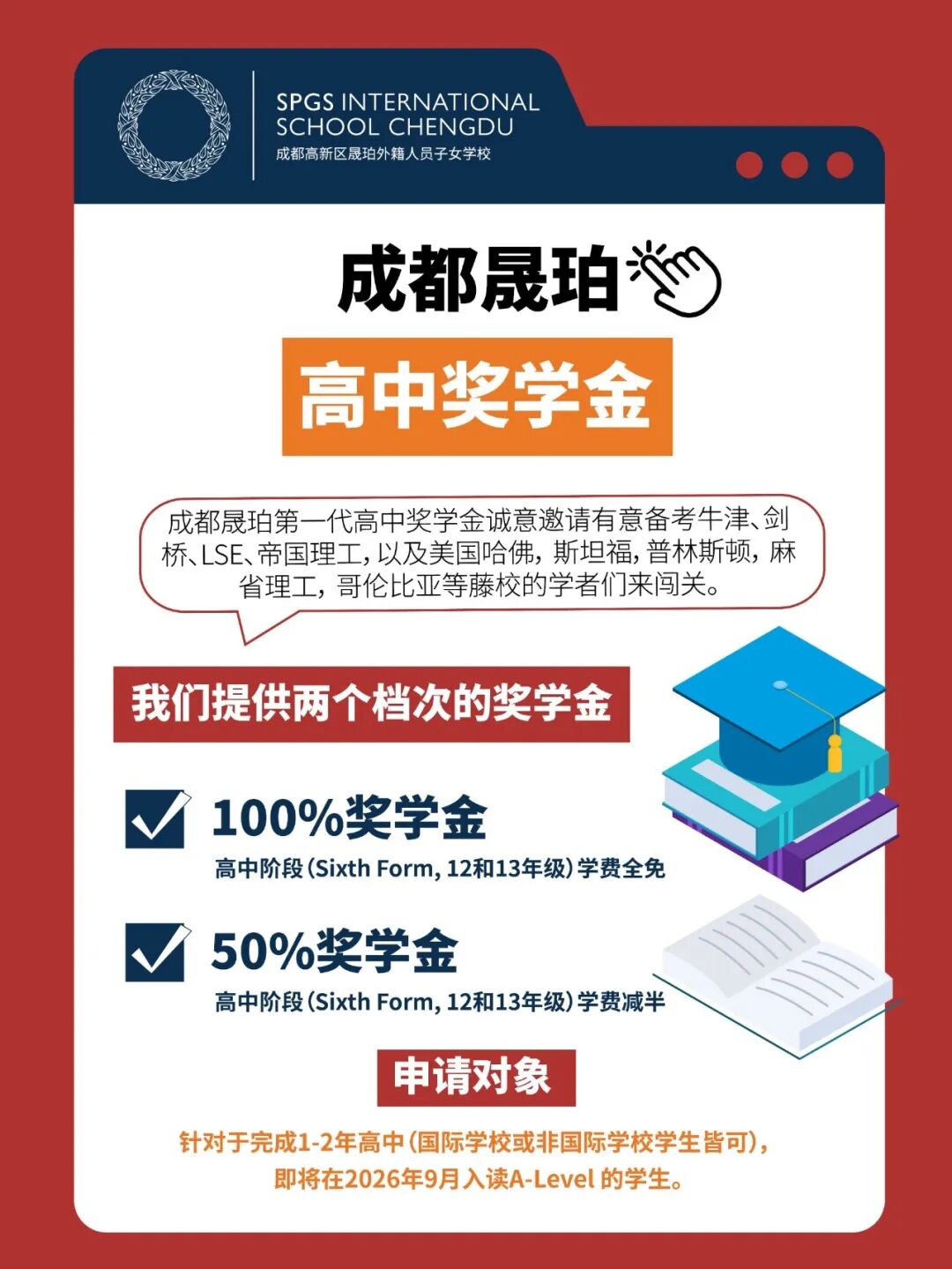 SPGSI Chengdu Sixth Form Scholarship opens doors to the world’s top universities for every outstanding, hardworking, and ambitious student.